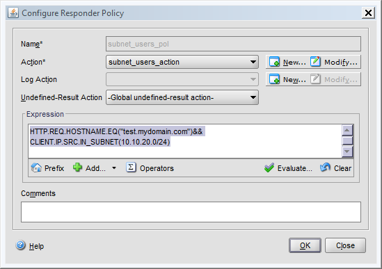 HTTP.REQ.HOSTNAME.EQ(“test.mydomain.com”)&& CLIENT.IP.SRC.IN_SUBNET(10.10.20.0/24)