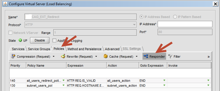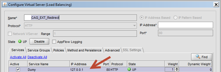 Notice on the screenshot below, I simply created a service name “Dummy” and gave it the NetSacalers localhost IP 127.0.0.1, this is simply to make sure the TCP 80 VIP is able to come up under the AGEE IP (Since AGEE ONLY runs under TCP 443). Note that Responder actions will not work under down VIPs.