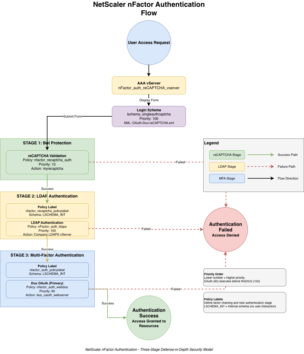 This nFactor implementation represents a production-ready authentication architecture suitable for enterprise environments requiring defense-in-depth security. The combination of reCAPTCHA, LDAPS, and Duo MFA creates multiple barriers against unauthorized access while maintaining a streamlined user experience.